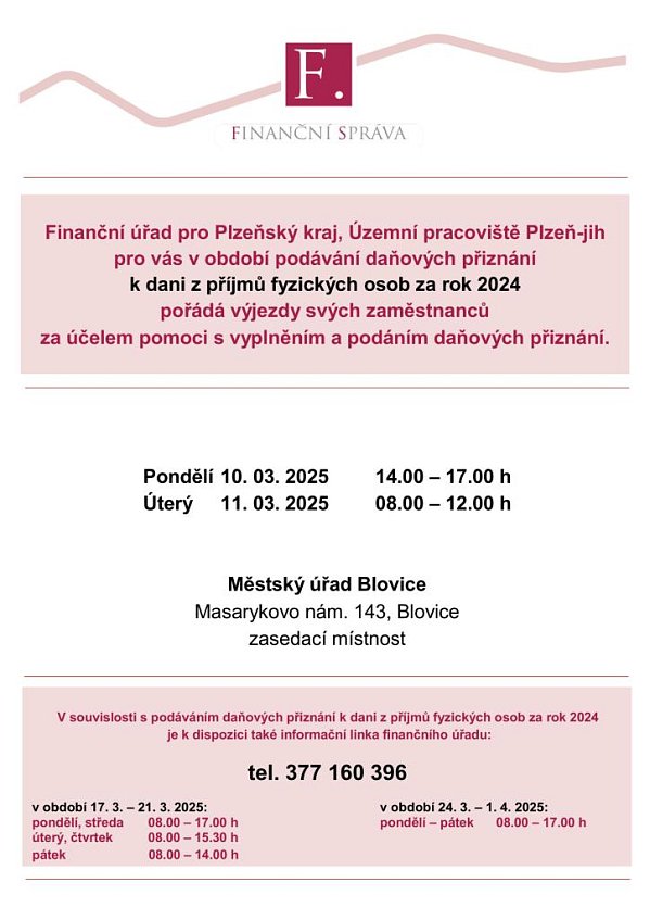 Zaměstnanci FÚ budou k dispozici 10. a 11. března 2025 v zasedací místnosti radnice v Blovicích.